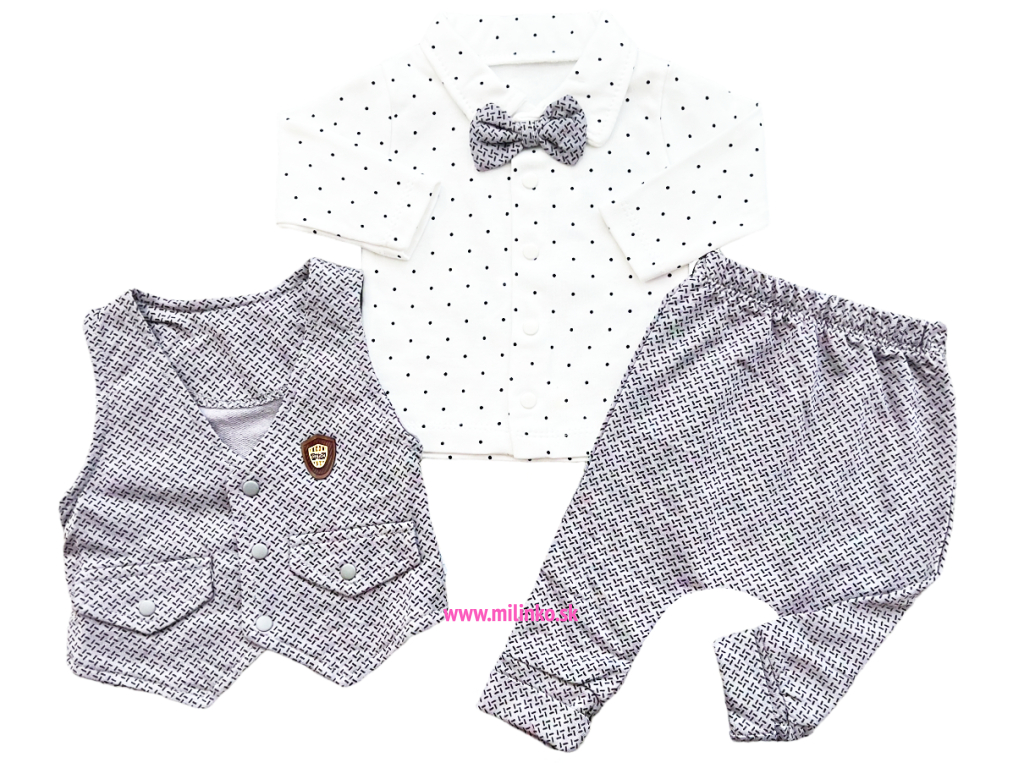 Krásny športovo-elegantný chlapčenský set na slávnostné príležitosti. Elegantné oblečenie pre bábätká. Elegantný set je vyrobený z 100% bavlny, vďaka čomu bude nosenie tohto setu veľmi príjemné pre Vaše bábätko. Chlapčenský elegantný set obsahuje vestu, košeľu so zapínaním na gombíky a nohavice. Set obsahuje aj moderný motýlik. Elegantné kojenecké oblečenie.