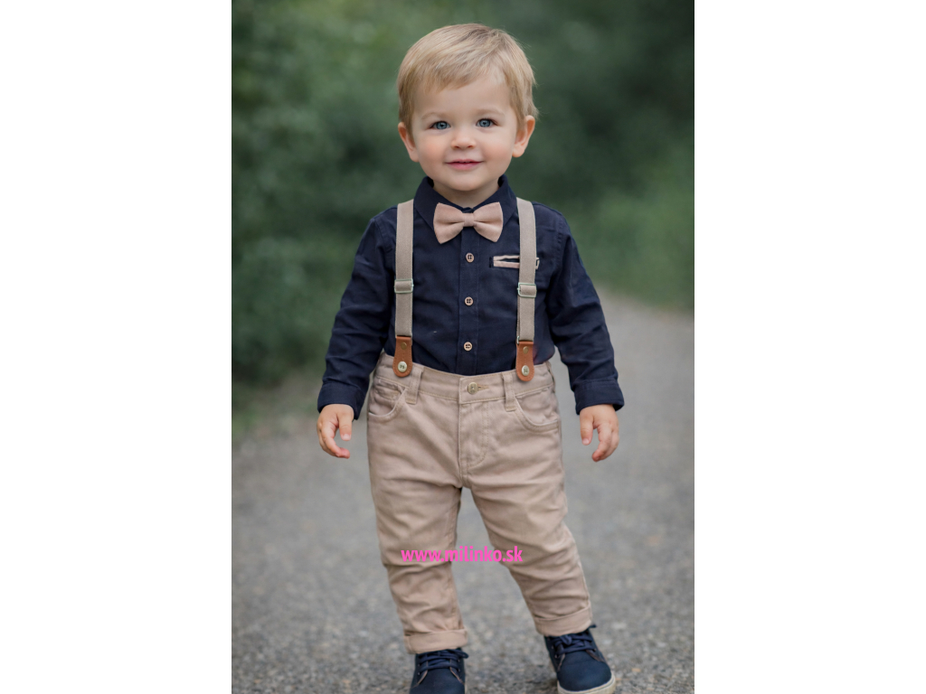 4dielny módny set pre chlapcov. Tento nádherný detský set sa skladá z ľahkej košele na dlhý rukáv, z motýlika, z nohavíc a z trakov. Nádherný detský set na sviatočné príležitosti.
