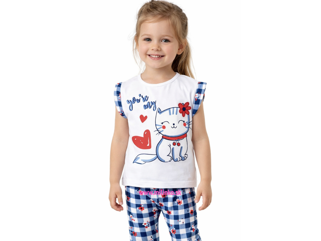 2dielny set pre bábätká s obrázkom. Set kojeneckého oblečenia sa skladá z trička a z 3/4 legín. Tričko je zdobené obrázkom rozprávkovej mačičky a nápisom ,,You are my (obrázok srdiečka),,-,,Si moja láska,,. Legíny sú v páse na gumičku, majú károvanú potlač a sú zdobené kvetinkami. Kvalitné kojenecké oblečenie.