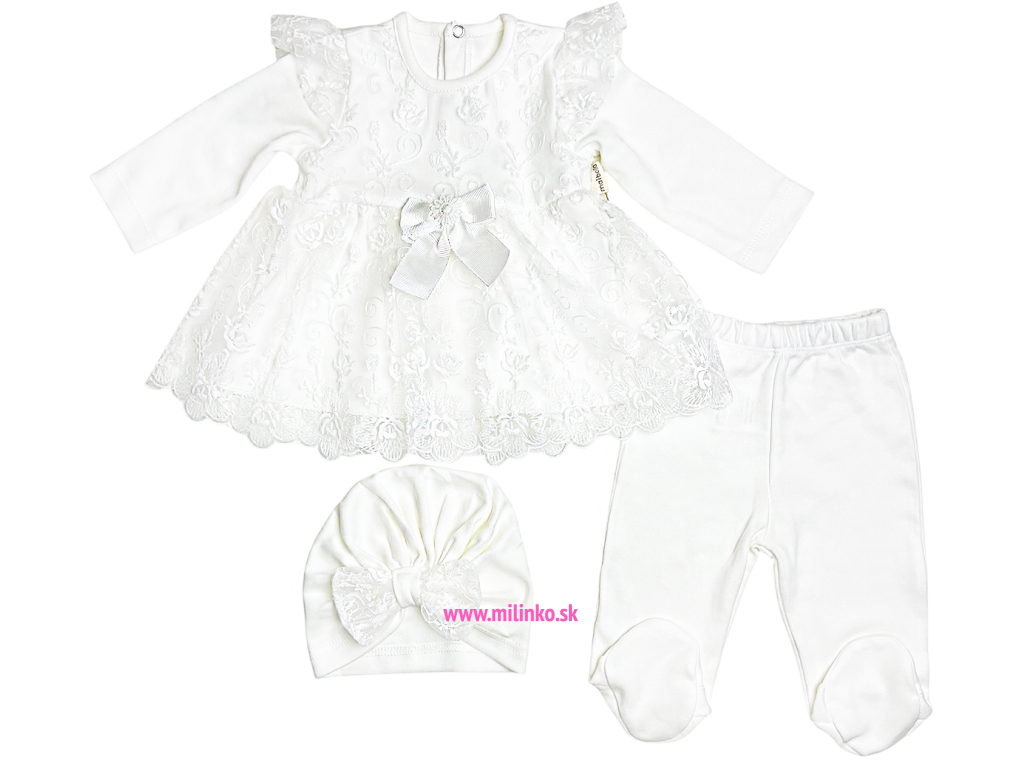 3-dielna súprava pre bábätká je ideálnou voľbou na krstiny, fotenie alebo akúkoľvek slávnostnú príležitosť. Súprava obsahuje krásne šaty zdobené jemnou čipkou (tüllom), k nim ladia polodupačky a krásna turbánová čiapka. Materiál: 100 % bavlna – pohodlná, priedušná a šetrná k pokožke.