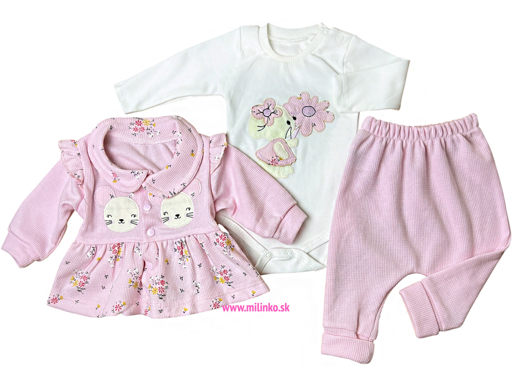 Krásny, kvalitný set pre bábätká. Detský set obsahuje nohavice v páse na gumičku, body s dlhým rukávom a mikinu so zapínaním na patenty. Set je vhodný na každú príležitosť.