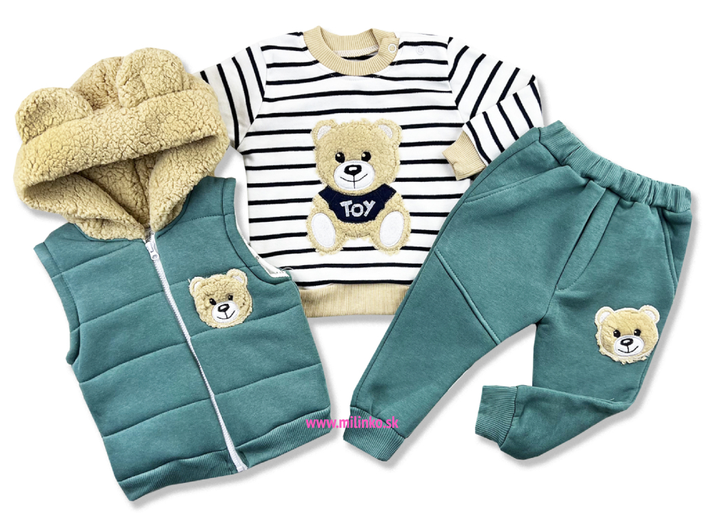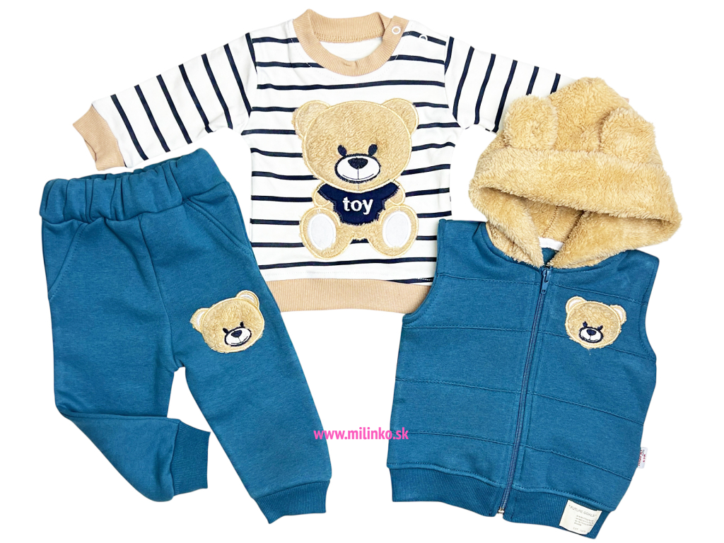 Detský set pre bábätká od tureckej značky je vhodný ako prechodný set na jeseň alebo na jar. Je vyrobený z kvalitnej 100% bavlny, vďaka čomu bude nosenie tohto setu veľmi príjemné pre vaše deti. Detský set obsahuje teplú vestu so zapínaním na zips, tričko s nápisom a s dlhým rukávom a nohavičky pre bábätká.