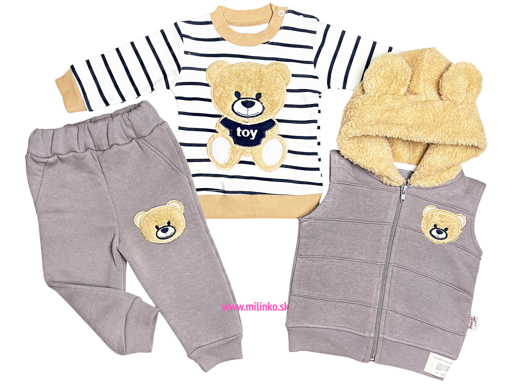 Detský set pre bábätká od tureckej značky je vhodný ako prechodný set na jeseň alebo na jar. Je vyrobený z kvalitnej 100% bavlny, vďaka čomu bude nosenie tohto setu veľmi príjemné pre vaše deti. Detský set obsahuje teplú vestu so zapínaním na zips, tričko s nápisom a s dlhým rukávom a nohavičky pre bábätká.