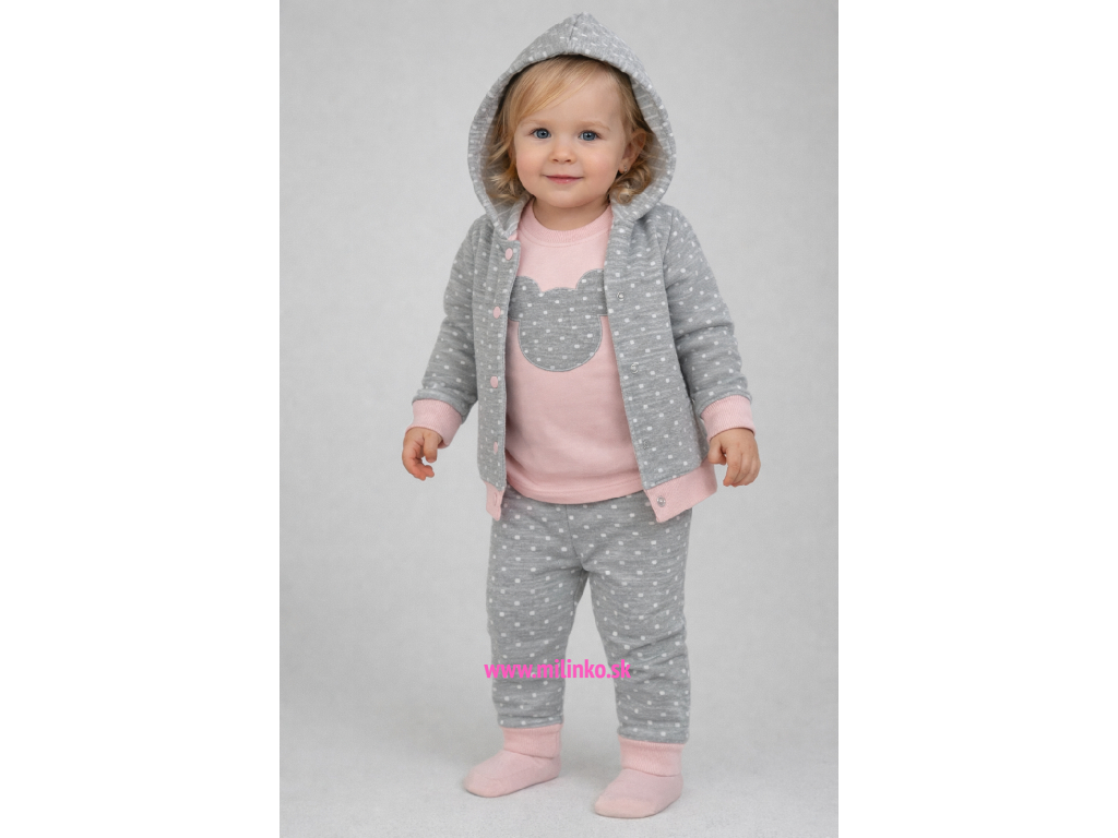 Kvalitné módne kúsky aj pre najmenších. Krásny dievčenský set aj v tých najmenších veľkostiach. Set od tureckej značky Elci sa skladá z troch častí. Set obsahuje sivý sveter s bodkami a mašličkou, bledoružové body na prednej strane pri hrudníku s vyšívaným obrázkom myšičky a bodkované sivé nohavice.