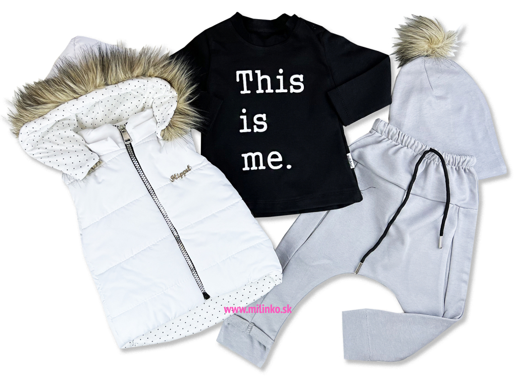 4 dielny set pre bábätká. Tento nádherný set obsahuje nohavice v páse na gumičku, tričko s nápisom na dlhý rukáv, čiapku s brmbolcom z umelej kožušiny a vystuženú vestu so zapínaním na zips. Vesta má odnímateľnú kapucňu, ktorá je ešte zdobená umelou kožušinou. Praktické oblečenie na prechodné obdobie.