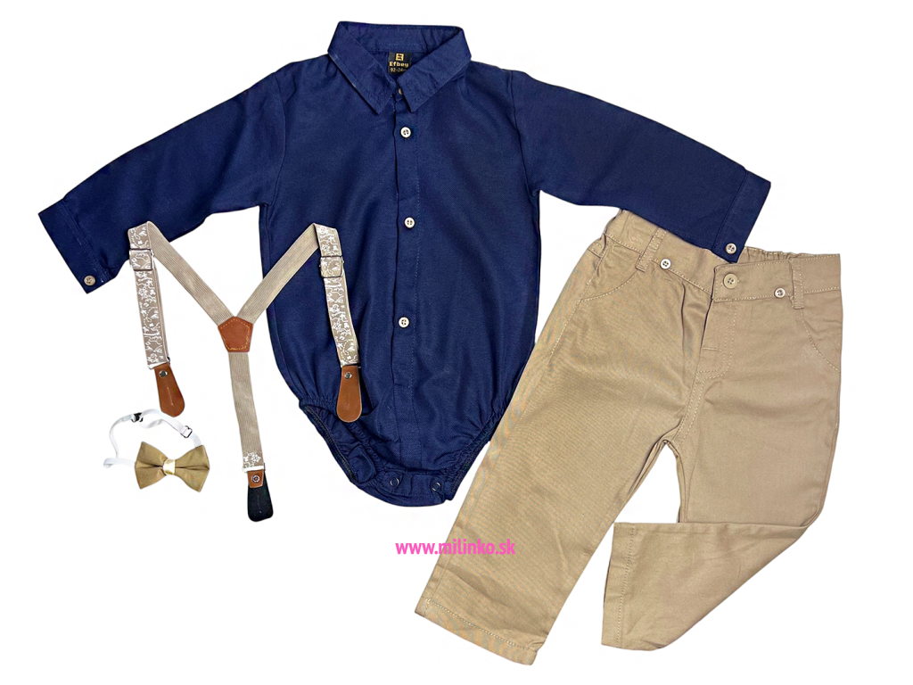 4 dielny kojenecký set pre chlapcov. Tento ľahučký kojenecký set pozostáva z košeľového body na dlhý rukáv so zapínaním na gombíky, z nohavíc pre bábätká s trakmi a z motýlika. Celý set je dokonale farebne zladený a je vhodný na slávnostné príležitosti.