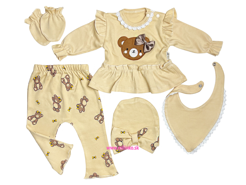 Súprava sa skladá z 5 dielov: vrchného dielu, polodupačiek, podbradníka, čiapky a rukavičiek. Vyrobené z kvalitnej bavlny.