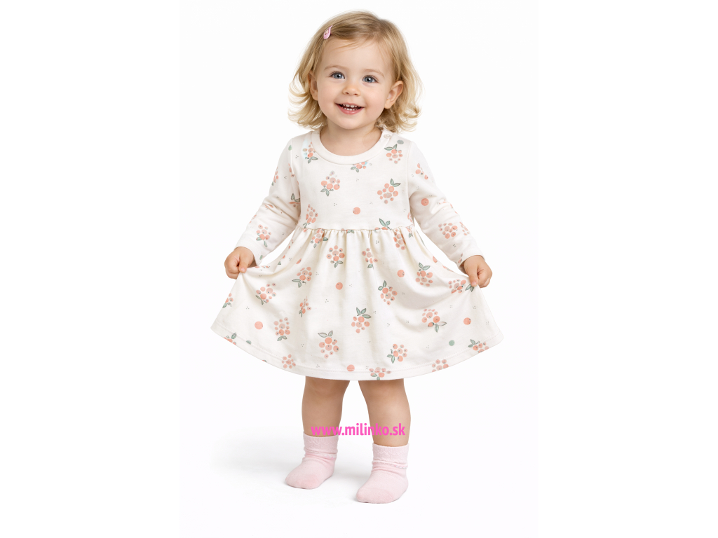 Nádherné dievčenské šaty na dlhý rukáv. Šaty sú ozdobené jemnou potlačou. V strede sú trošku nazbierané a zapínajú sa na pleciach na patenty. Šaty sú vyrobené z veľmi kvalitného materiálu vďaka čomu nosenie tohto setu je veľmi príjemné pre Vaše bábätko