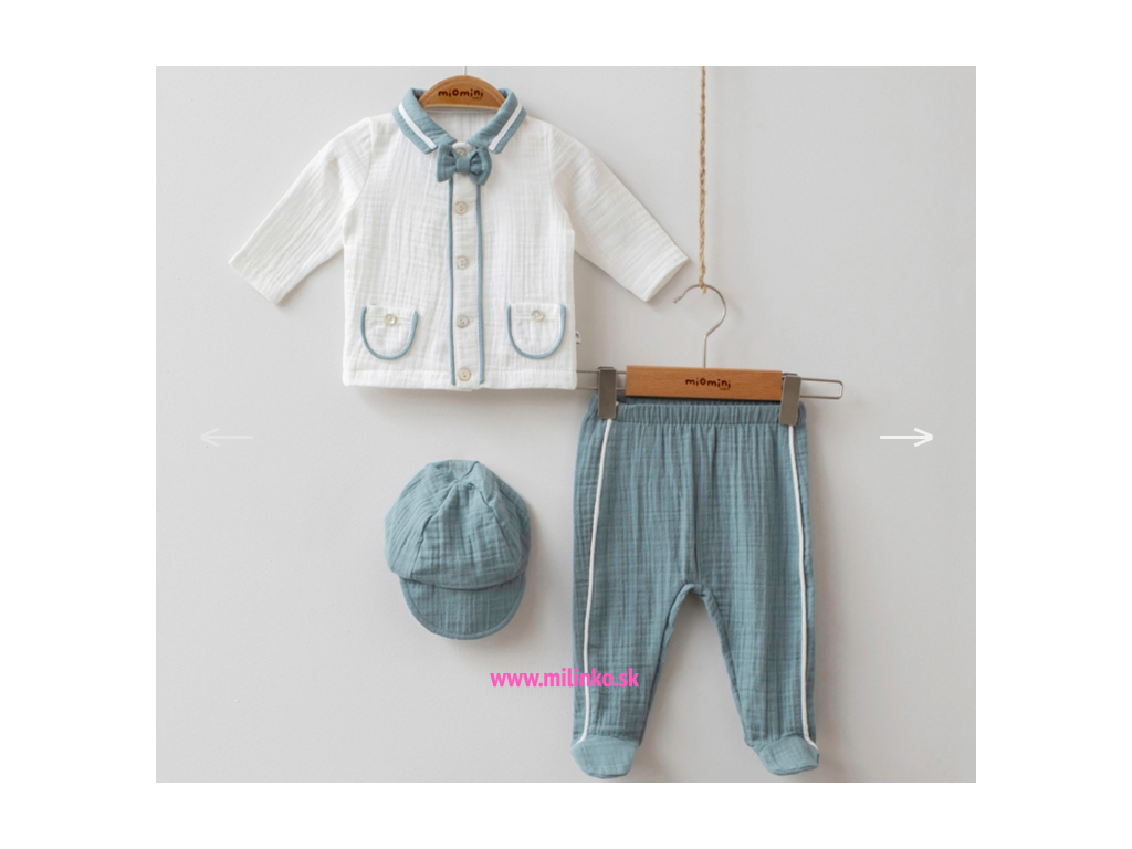 Krásny elegantný chlapčenský set na slávnostné príležitosti. Elegantné oblečenie pre bábätká. Dojčenský set obsahuje košeľu s motýlikom ktorý sa zapína na patent nohavice pre bábätká a čiapku. Elegantné detské oblečenie je nevyhnutnou súčasťou každého detského šatníka. Elegantné kojenecké oblečenie.