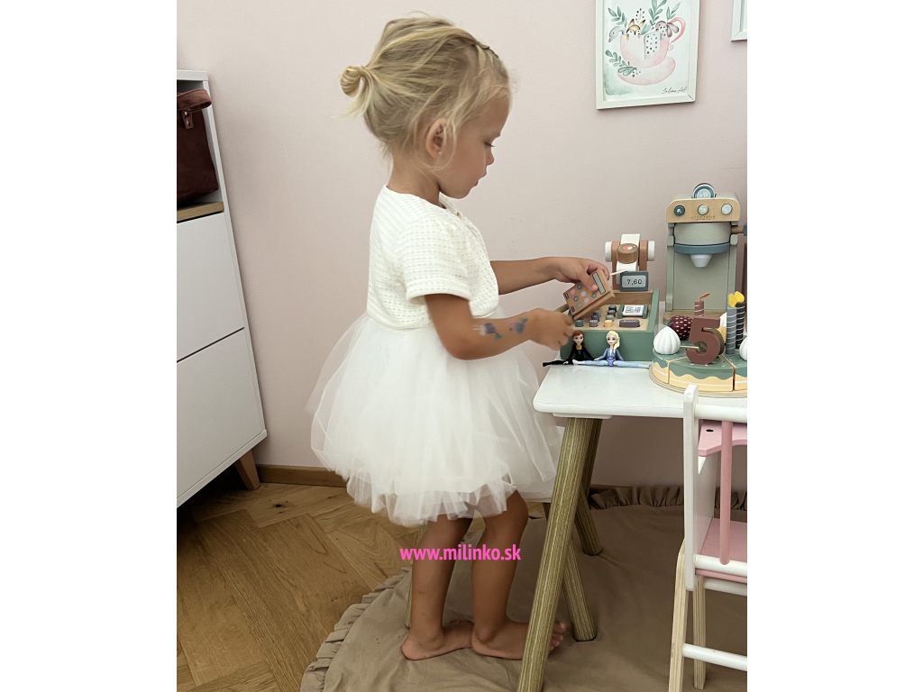 Detské spoločenské oblečenie pre bábätká. Prekrásne dievčenské spoločenské šaty na krst alebo na svadbu. Krásne, rozšírené šaty s tylovou sukňou (100% polyester) pod ktorou sa nachádza spodnička. K setu patrí aj bolerko. Vrchná časť a spodná časť sukne je vyrobená zo 100% bavlny, vďaka ktorej nosenie týchto šiat bude pohodlné pre vaše dievčatko.