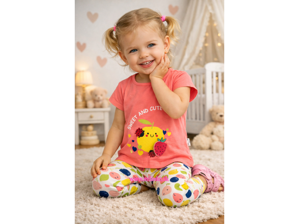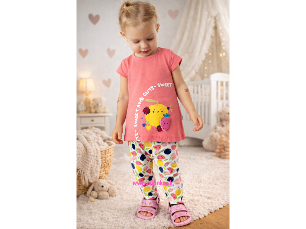 2dielny set pre bábätká s obrázkom. Set kojeneckého oblečenia sa skladá z tuniky na krátky rukáv z 3/4 legín. Tunika je zdobená potlačou ovocia, lienky a malou 3D aplikáciou . Legíny sú v páse na gumičku. Kvalitné kojenecké oblečenie.